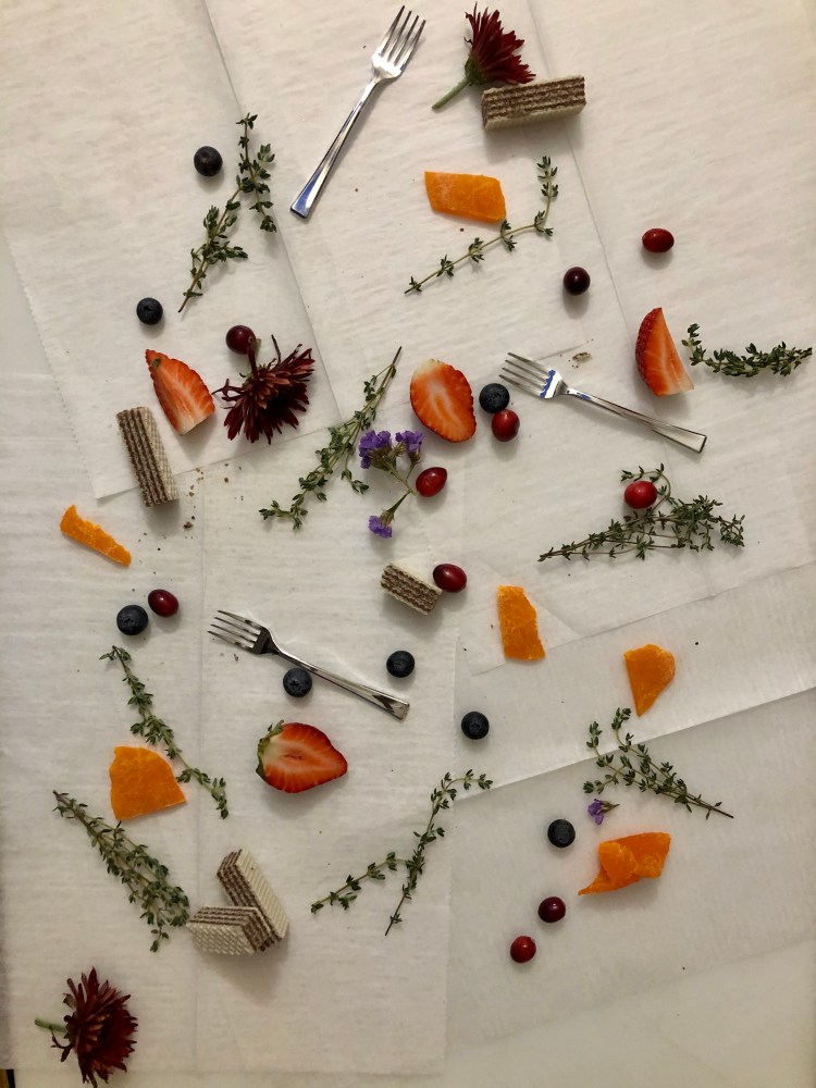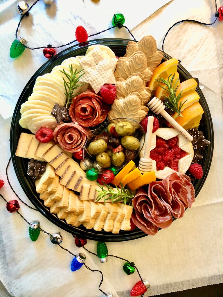 3 cheeses (soft & hard & specialty), 3 meats (spicy & mild), olives, dried mango, maple cream cookies, hazelnut wafers, & dark chocolate peppermints